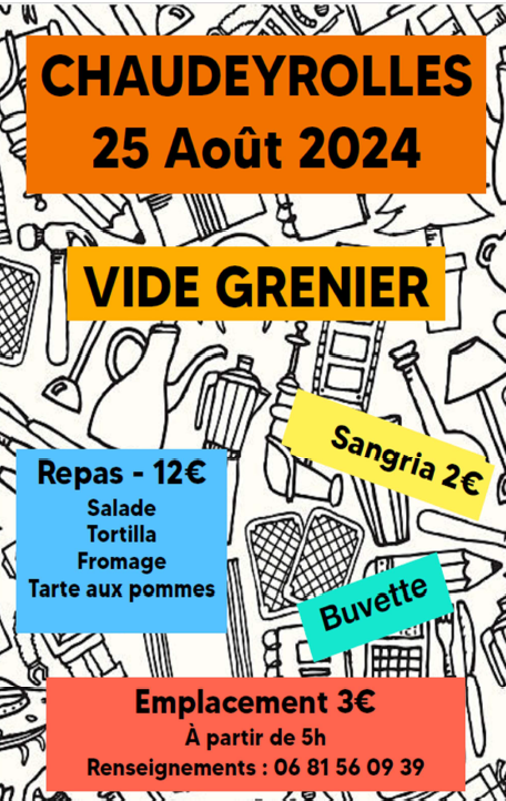 Le vide grenier aura lieu le dimanche 25 août 2024 toute la journée. Possibilité de restauration sur place : ambiance espagnole tortilla et sangria Venez nombreux