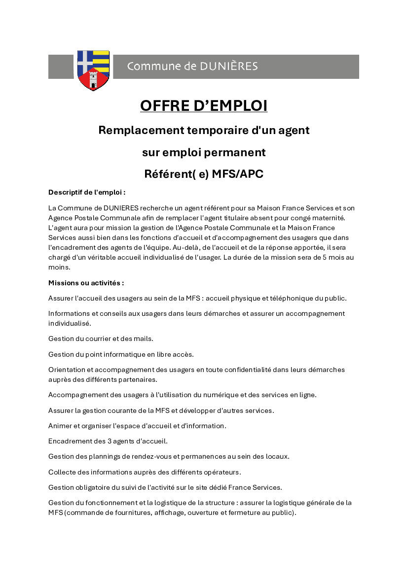 Offre d'emploi 25-01-07 La Commune de DUNIERES recrute pour un remplacement un(e) référent(e) Maison France Services / Agence Postale Communale.