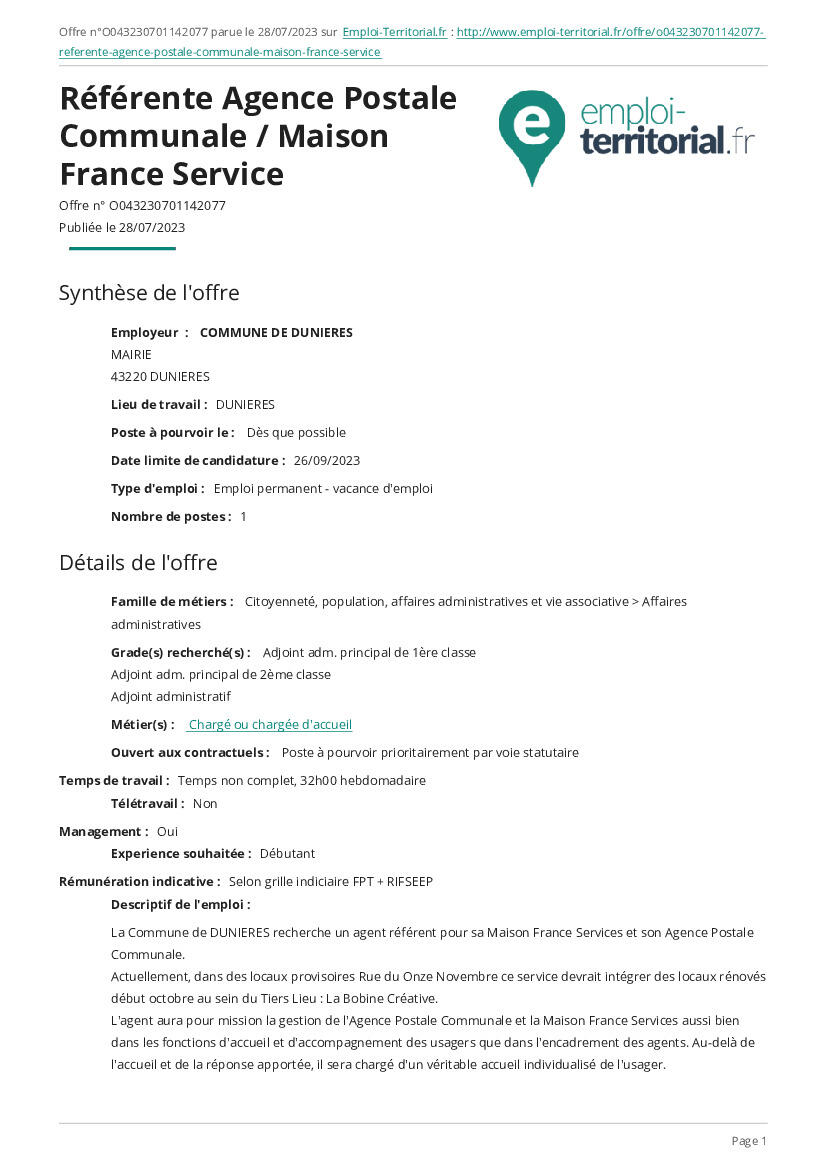 Offre d'emploi Commune de Dunières : Référent(e) APC / MFS 23-07-31 Référent(e) Agence Postale Communale et Maison France Services.