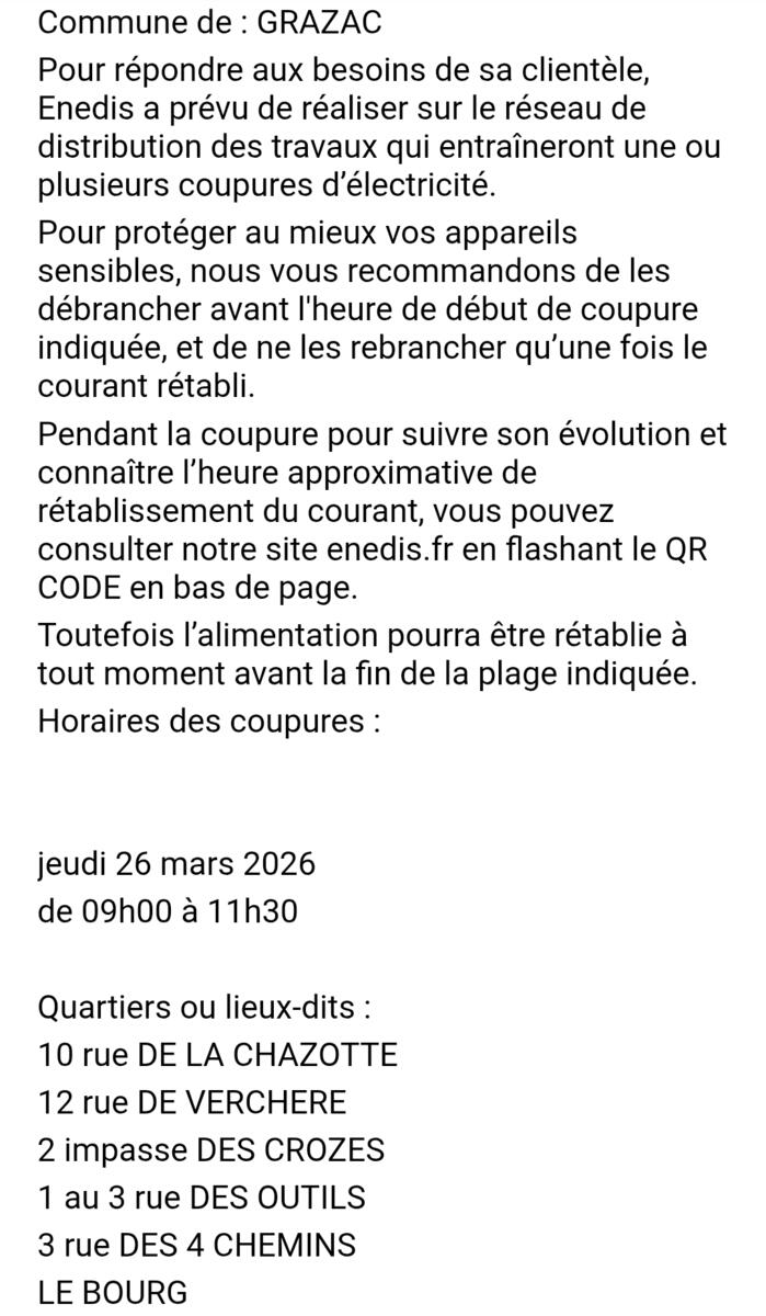 Enedis vous informe d'une coupure d'électricité programmée le 26/03/2026 sur la commune de GRAZAC