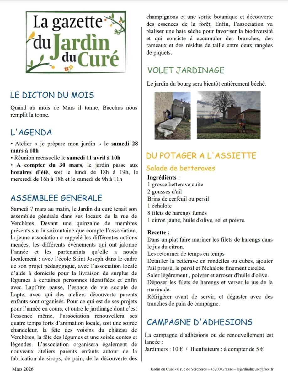 Votre mairie / Actualités / Le Jardin du Curé: 🪴🌰🫘🧄🧅 Gazette Mars 2026.