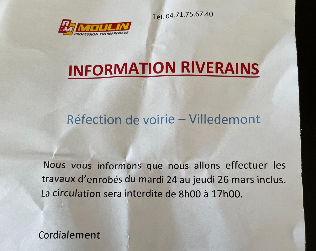🚧Travaux Villedemont: Circulation interdite pour enrobés.