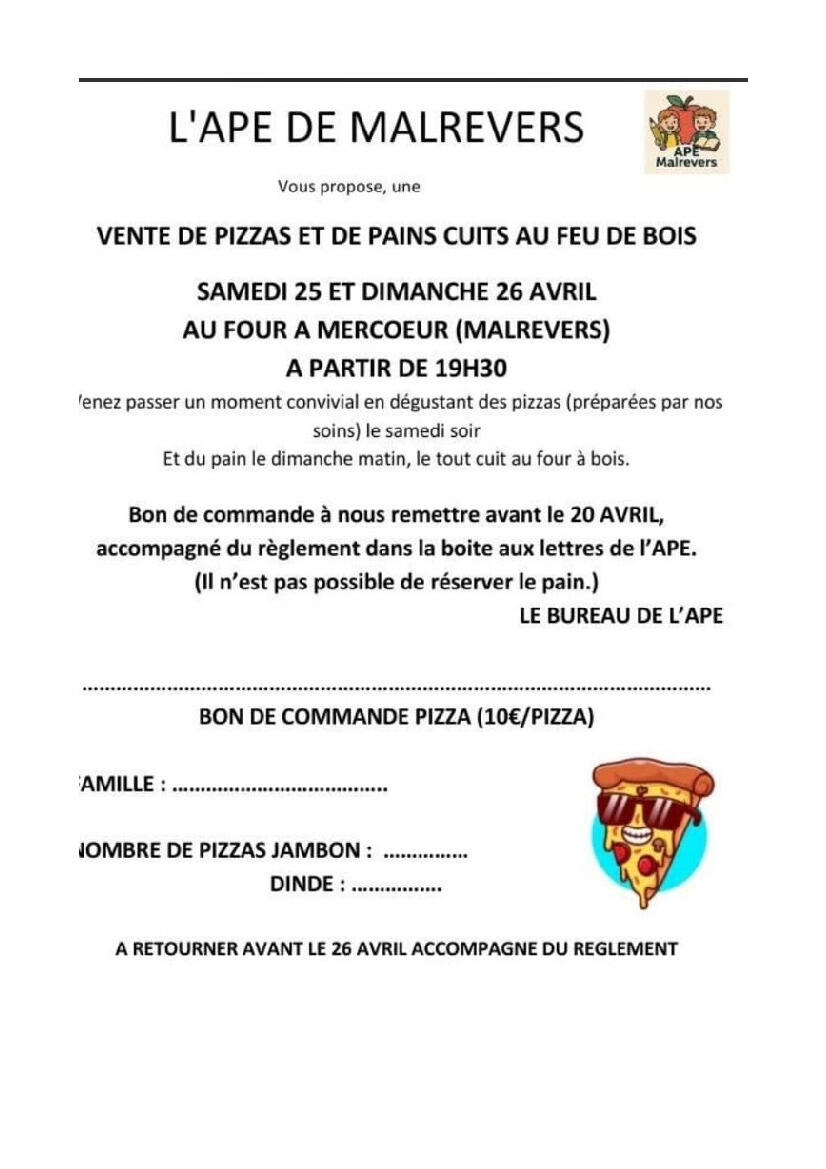 L'APE vous propose une vente de pizzas et de pain cuits au feu de bois