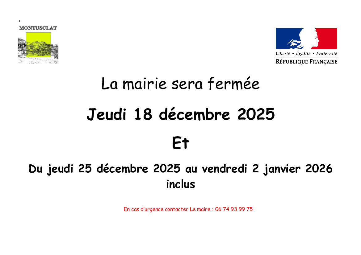 Pour cette fin d'année, fermeture de la mairie.