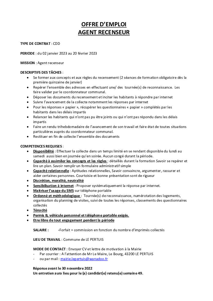 Si cet emploi vous intéresse n'hésitez pas à postuler à mairie.lepertuis@wanadoo.fr avant le 30 novembre