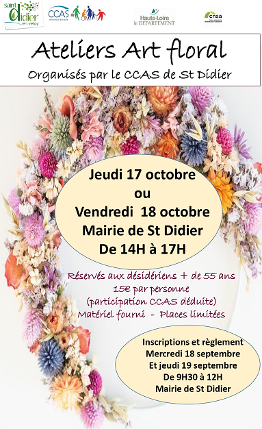 Ateliers art floral 24-09-16 Le CCAS organise un ateliers d'art floral le 17 ou 18 octobre pour y participer, venez vous inscrire en Mairie le 18 et 19 septembre de 9h30 à 12h.