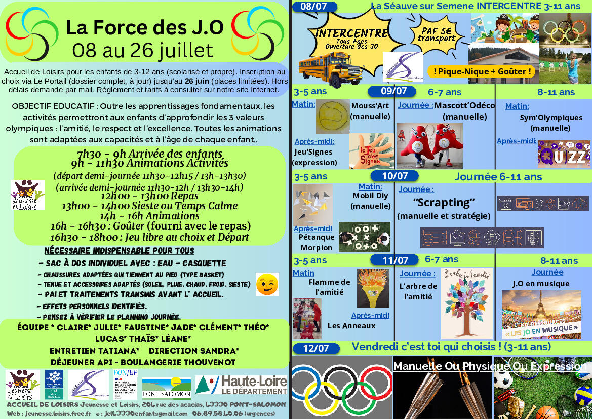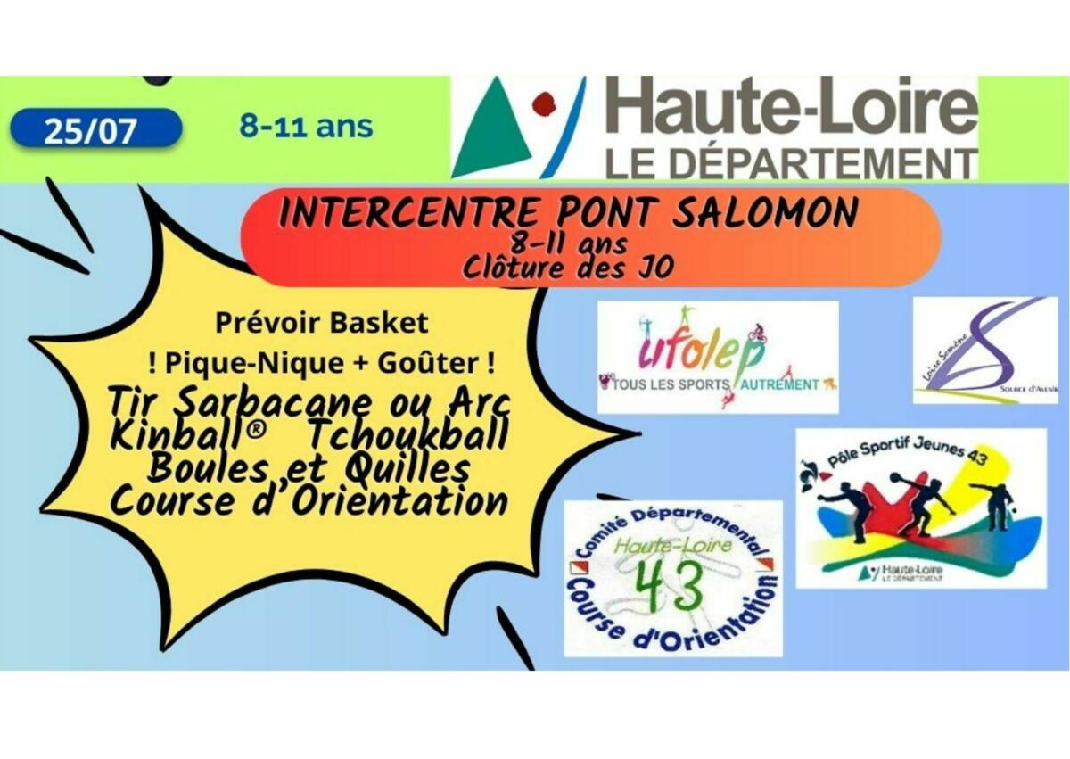 Inter centre jeudi 25 pour les enfants nés entre 2016 et 2012. Regroupement des enfants du territoire de Loire Semène (Aurec, St Just, St Didier, Pont/Saint Fé) pour avoir plus de copains et copines avant la rentrée au collège ! 5 groupes, 5 activités innovantes financées par Le Conseil Départementale de La Haute-Loire.