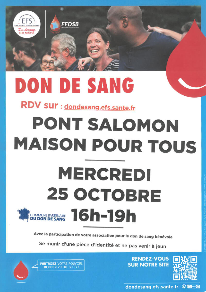 Don du sang - 25 octobre - Pont Salomon 23-10-18 🩸 Don du sang à Pont Salomon à la Maison pour tous le 25 octobre de 16h à 19h