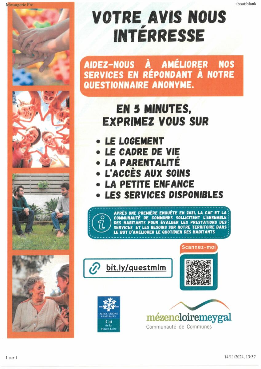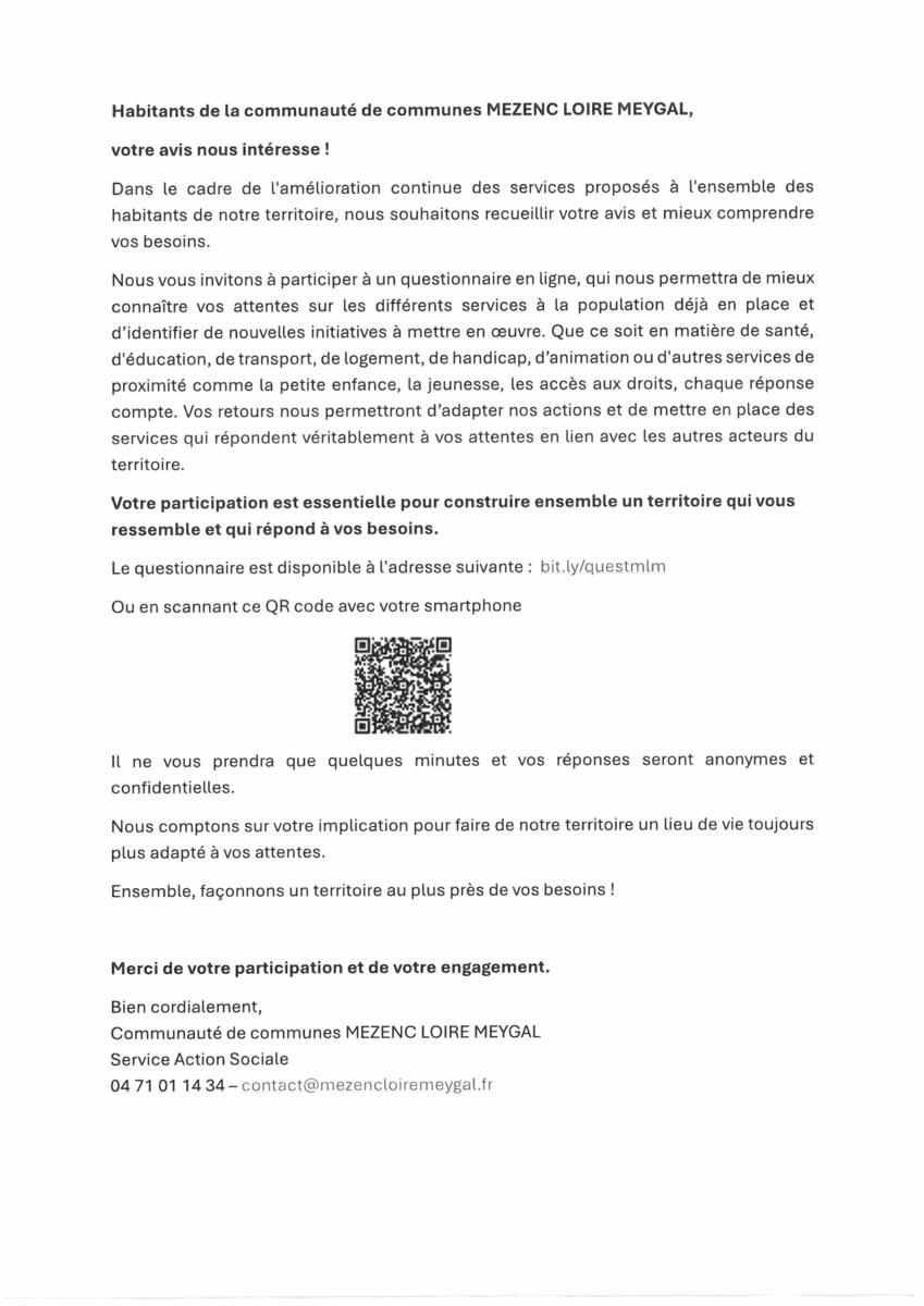 Dans le cadre de l'amélioration continue des services proposés à l'ensemble des habitants de notre territoire, la communauté de commune Mezenc-Loire-Meygal souhaite recueillir votre avis et mieux comprendre vos besoins.
