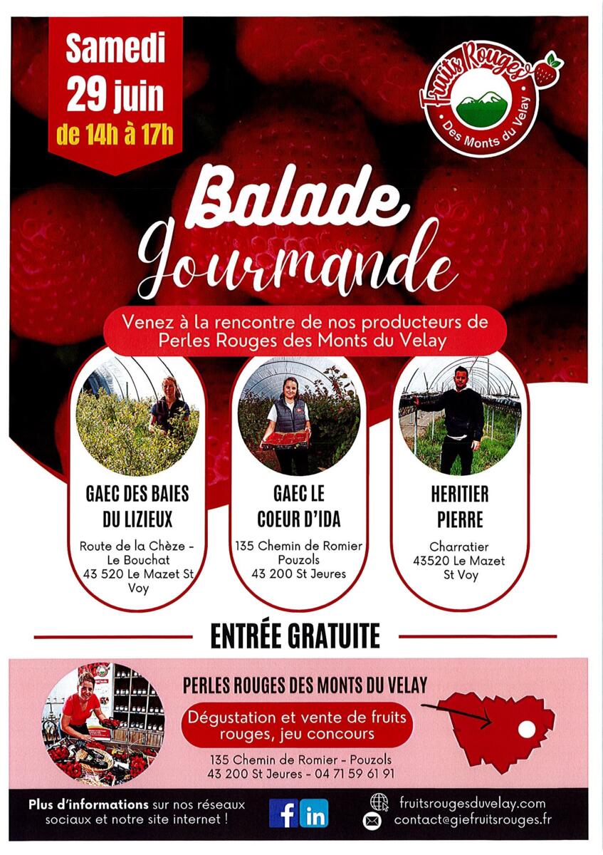 Balade Gourmande 24-05-25 🍓Perles Rouges des Monts du Velay🍓Balade gourmandeSamedi 29 juin de 14h à 17h