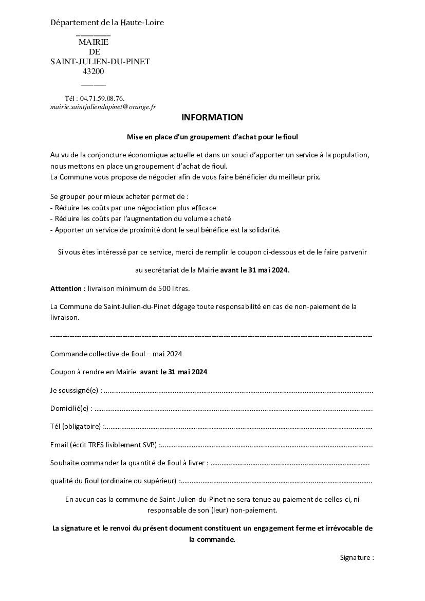 ⚠️ La mairie fait l'intermédiaire gratuitement pour constituer une liste de personnes intéressées et négocier au meilleur prix le litre de fioul. Le fournisseur retenu gère la livraison et la facturation. Le prix ne peut être négocié et connu que sur la base d'un volume, une fois la liste des personnes constituée.