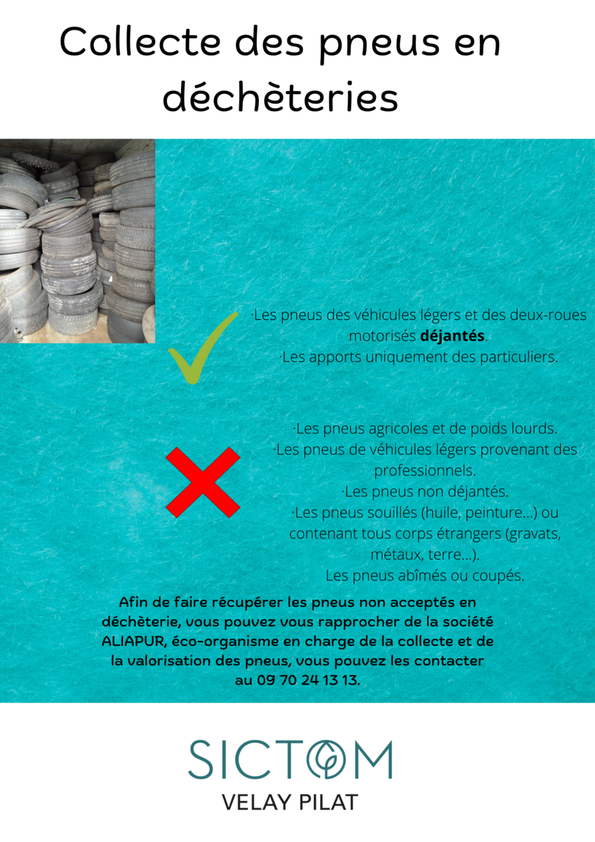 Afin de faire récupérer les pneus non acceptés en déchèteries, vous pouvez vous rapprocher de la société ALIAPUR, éco-organisme en charge de la collecte et de la valorisation des pneus, au 09 70 24 13 13.