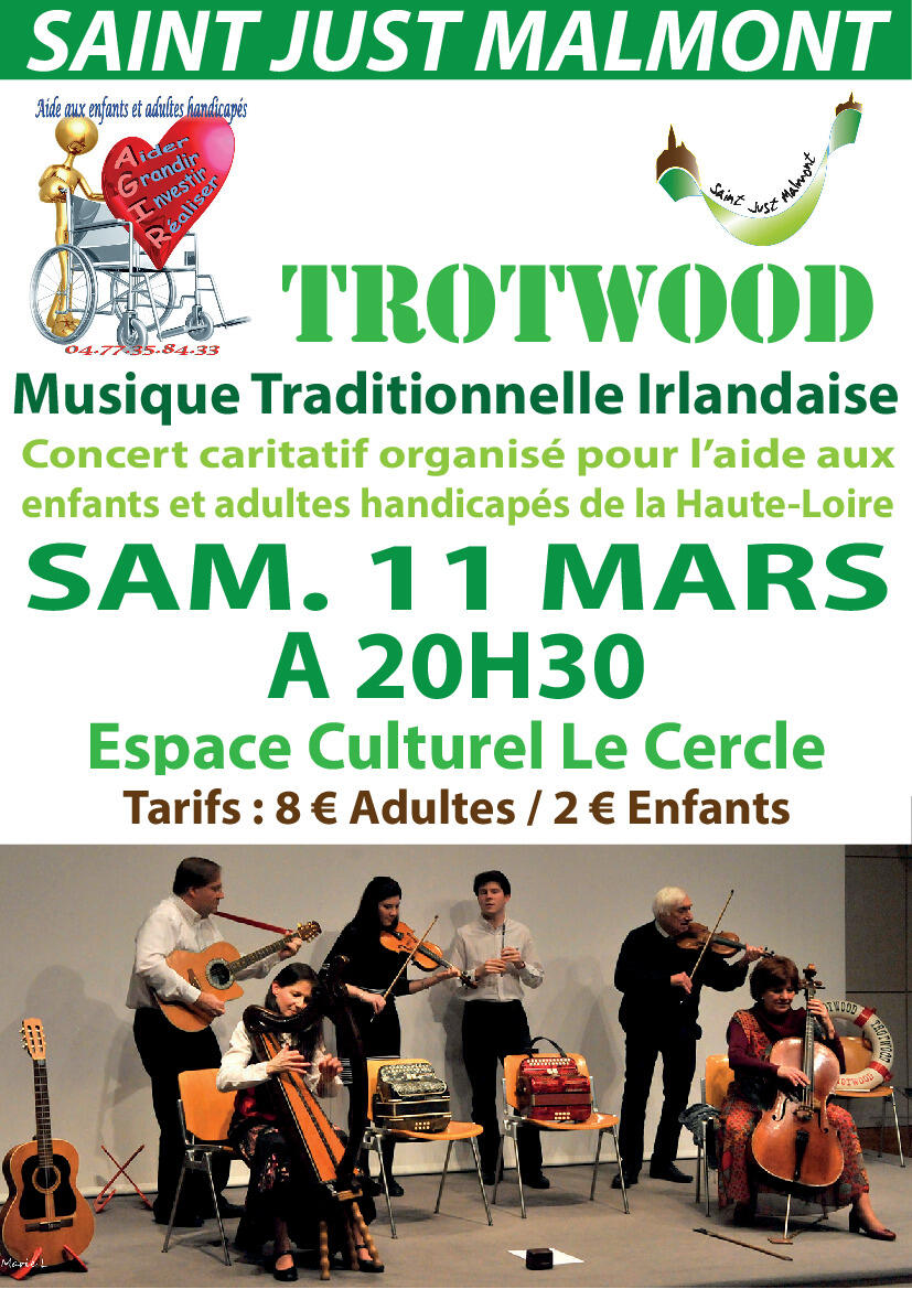 L'association AGIR organise un concert caritatif pour l'aide aux enfants et adultes handicapés de la Haute-Loire, avec la participation de Trotwood, groupe de musique traditionnelle irlandaise :