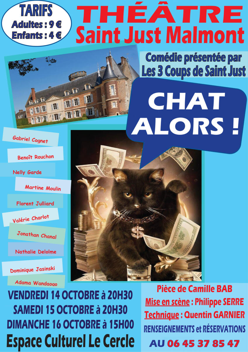 La troupe de théâtre "Les 3 Coups de Saint Just" vous présente sa nouvelle pièce, "CHAT ALORS !", une pièce de Camille BAB, mise en scène par Philippe SERRE, à l'Espace Culturel Le Cercle :
