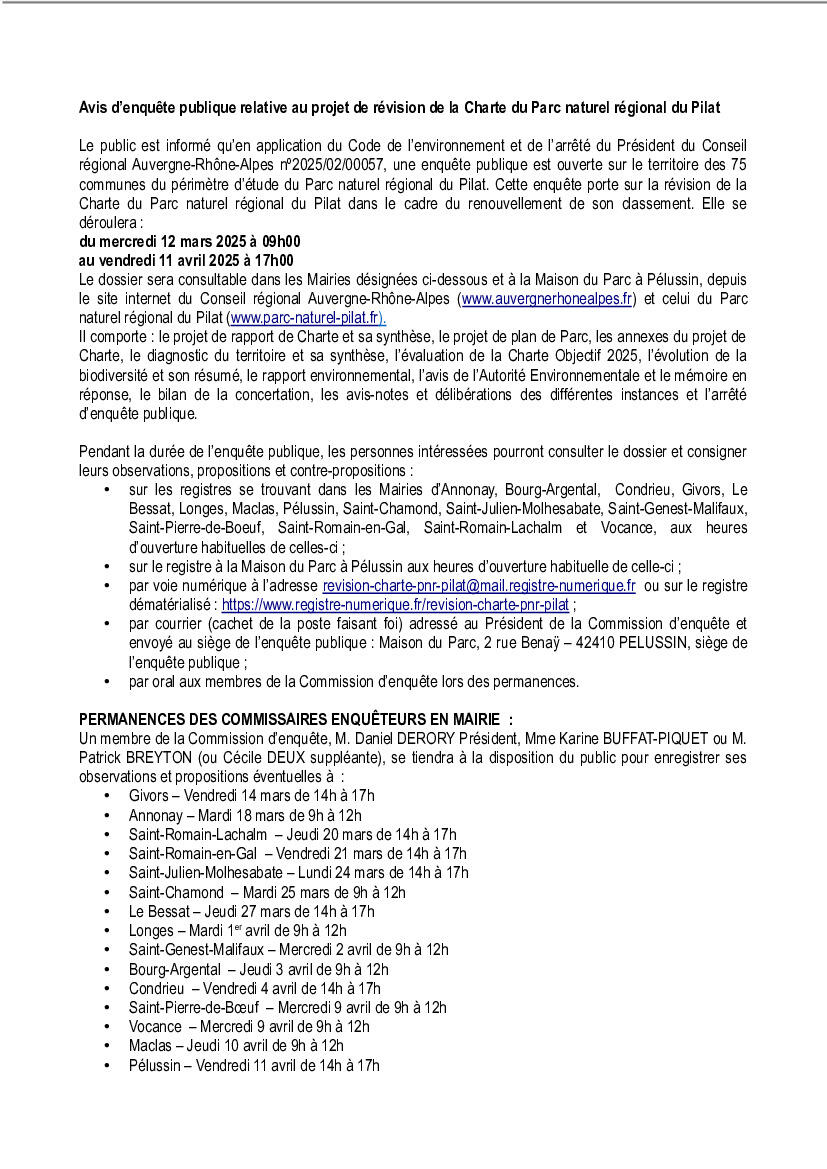 Charte Parc Naturel du Pilat - Avis d'enquête publique