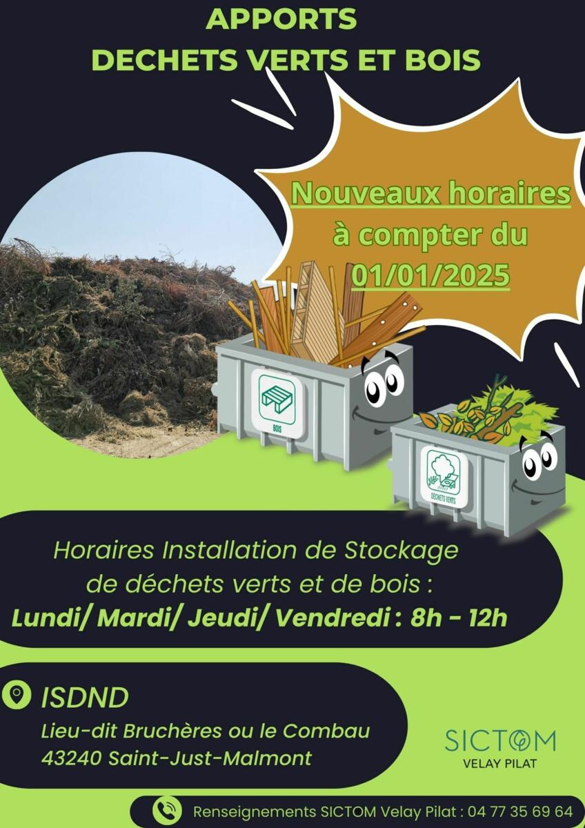Les horaires du centre de stockage au lieu-dit Bruchères-Le Combau à Saint-Just-Malmont pour le dépôt des déchets verts et du bois vont changer à compter du 01/01/2025.