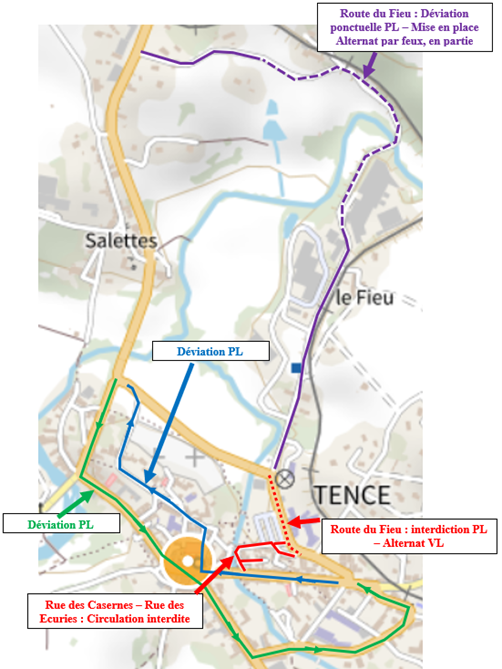 - La circulation sera interdite aux poids lourds (sauf service des ordures ménagères et livraisons de la maison de retraite, de la crèche et de la boulangerie). Les poids lourds seront déviés par le centre-bourg.