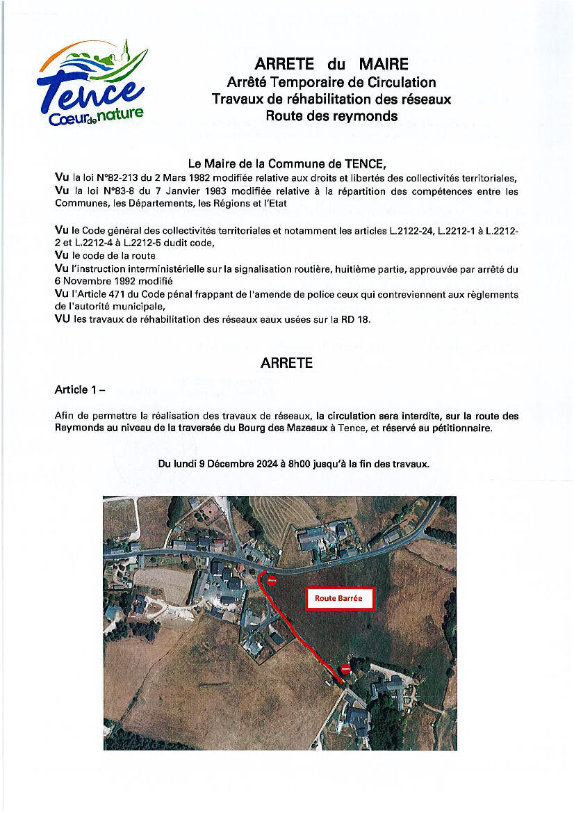 Afin de permettre la réalisation des travaux de réseaux, la circulation sera interdite sur la route des Reymonds, au niveau de la traversée du bourg des Mazeaux à Tence, à partir du lundi 9 décembre 2024 à 8h et ce, jusqu'à la fin des travaux.