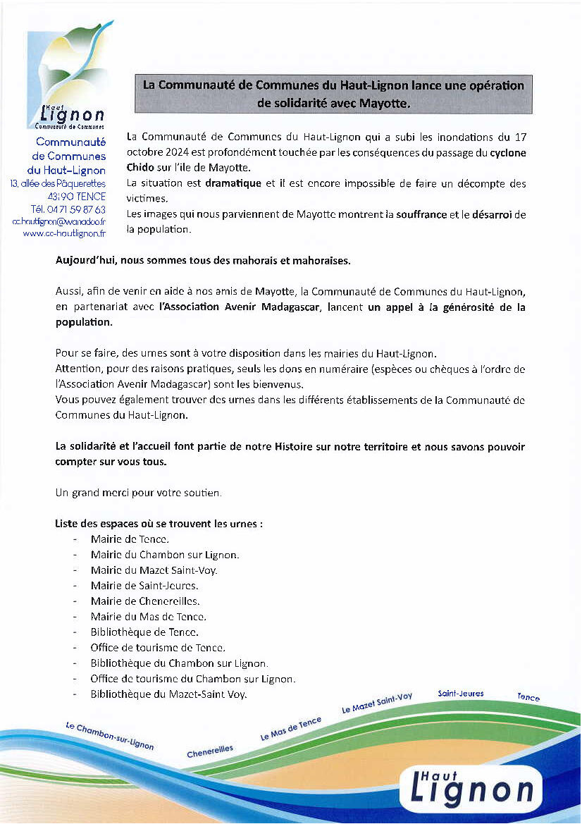 La communauté de communes du Haut-Lignon qui a subi les inondations du 17 octobre 2024 est profondément touchée par les conséquences du passage du cyclone Chido sur l’ile de Mayotte.