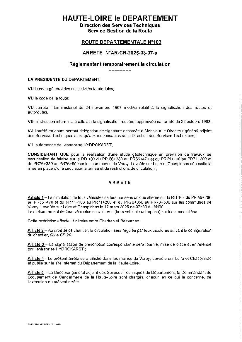 Arrêté du Département en information pour les gens qui circulent en voiture sur la RD 103 le 17 mars 2025.