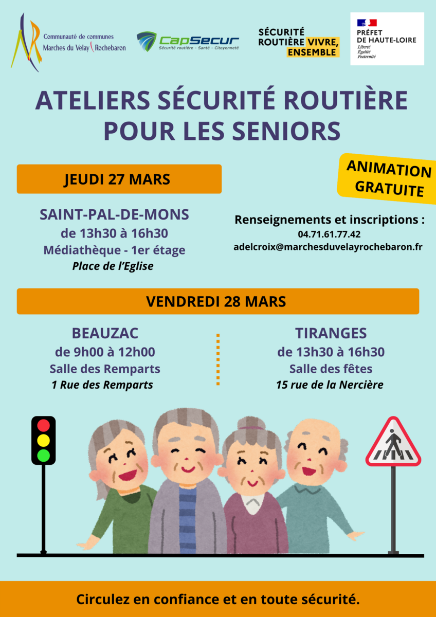 La Communauté de Communes Marches du Velay Rochebaron, en partenariat avec les communes et les CCAS, organise des ateliers gratuits pour aider nos aînés à réactualiser leurs connaissances du code de la route et à circuler en toute sécurité.