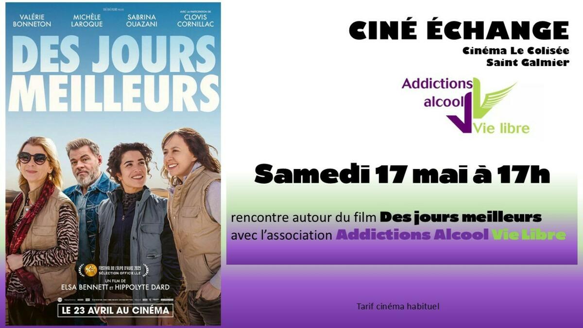 AprĂšs la projection du film DES JOURS MEILLEURSÂ đŸ€©Â le SAMEDI 17 MAI Ă  17H00 , l'association Addictions Alcool Vie Libre vous invite Ă  un Ă©change autour de l’expĂ©rience commune de la lutte contre une dĂ©pendance.